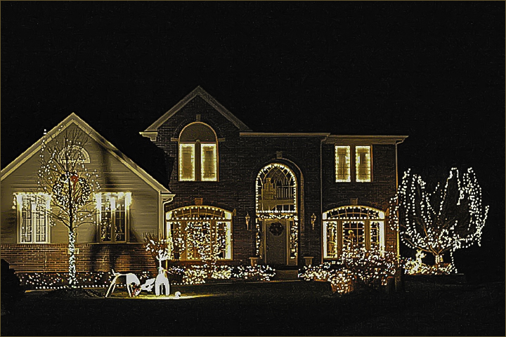 Beautiful image. I would, however, not leave the whole house dark, but would try cloning or content aware filling out the very bright lights in the windows and let the decorations light the house. |