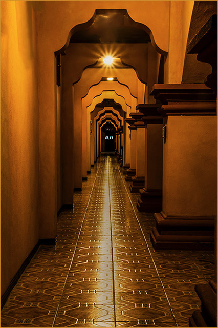 Beautiful Image. I do find both bright lights over the doorway a bit distracting so I removed the top one with a content aware fill. I don't think I'd eliminate the right side as it is an integral part of the building and I would definitely not crop the bottom which enhances the depth of field of that hallway. |