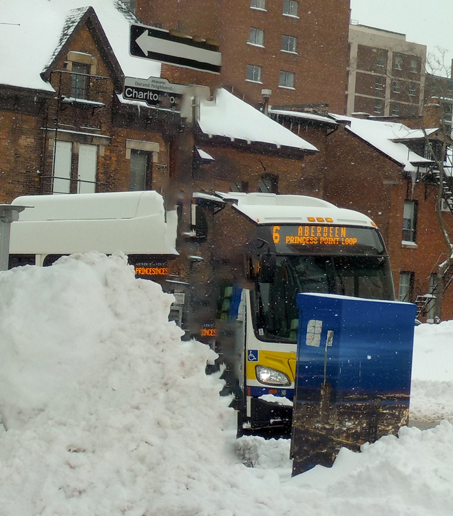 The image certainly tells he story of winter in Hamilton, but I feel as Judith did, that the tree is extraneous and results in dead space. I also found that huge pole on the left of the buss very obtrusive so with a few content aware fill moves, I removed. It's not a perfect fix, but with a bit more time and some cloning of the surroundings, you would have a much better image. |