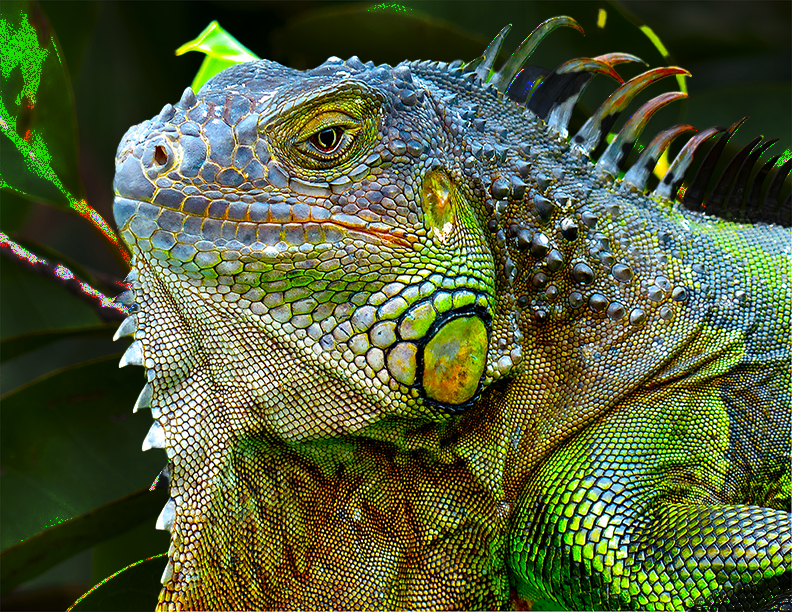 The iguana is tack sharp but aa bit too bright and the background is as Holly said too bright and distracting. Here's my suggestion...I went into image, adjust, vibance and adjusted the iguana down a bit and did the same with the background and then adjusted the saturation a bit as well. |