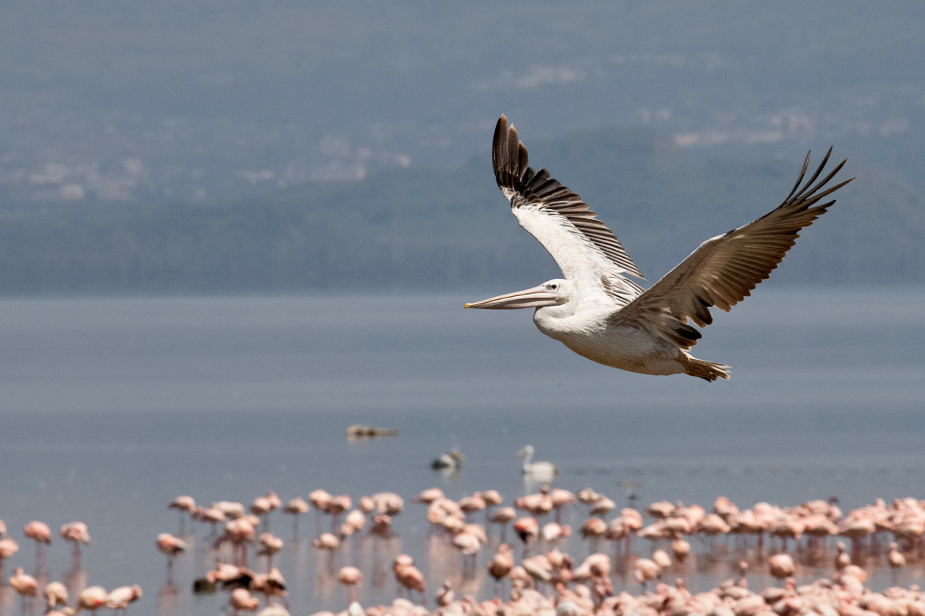 As for the crop/composition, the main thing I'd change is to re-frame it so the pelican is further right with more space "in front" and less "behind" the bird. Give it a bit more space to fly in to. I rather like having the flamingos there as it establishes the place. I just find that they're over-saturated and thus demand too much attention. Here's my take, going with much less dehaze and saturation.