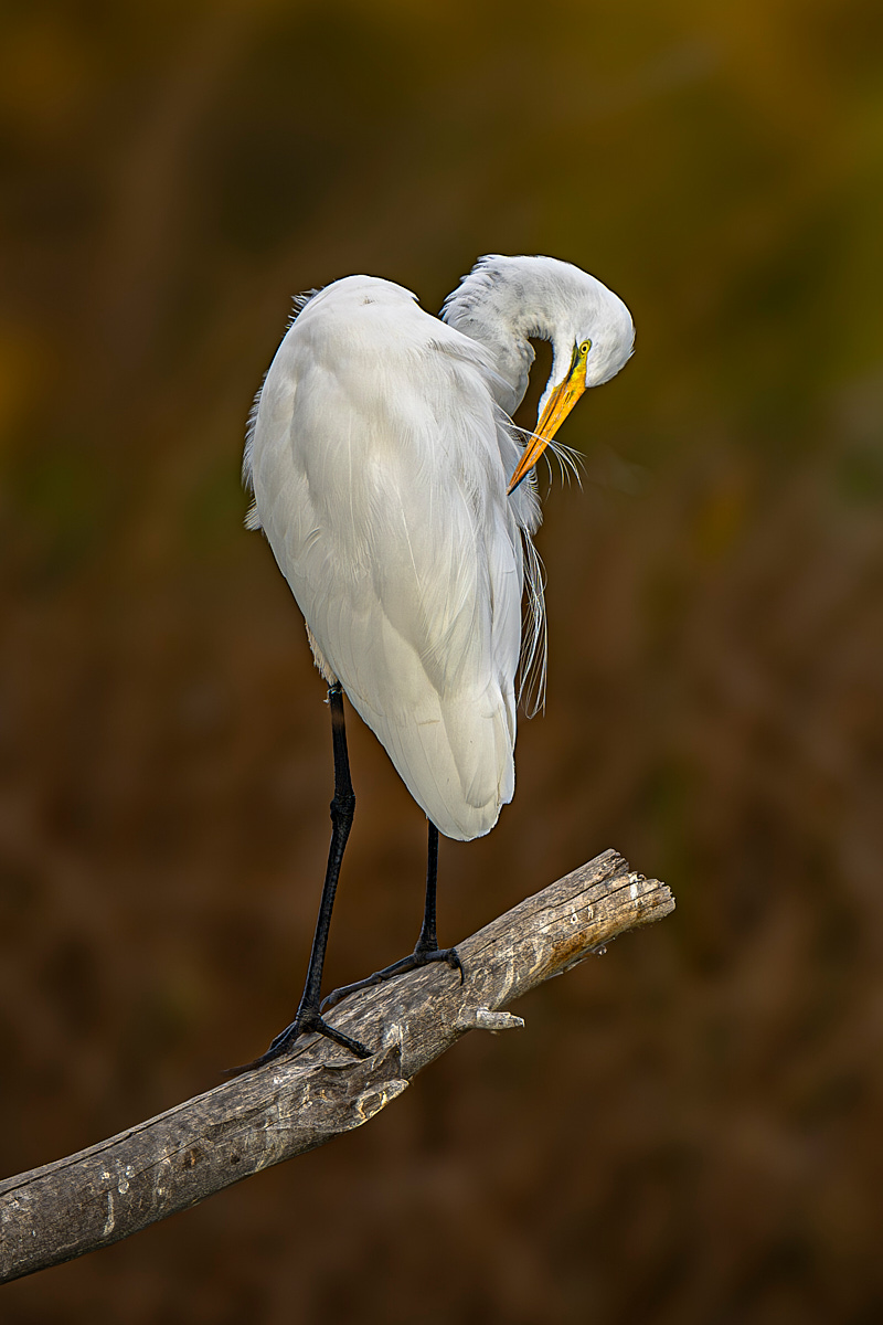 You managed to capture a really nice preening pose- this looks so elegant with the position of the bill and the one wispy feather going across it. The soft, golden background is a pretty complement to the white subject.