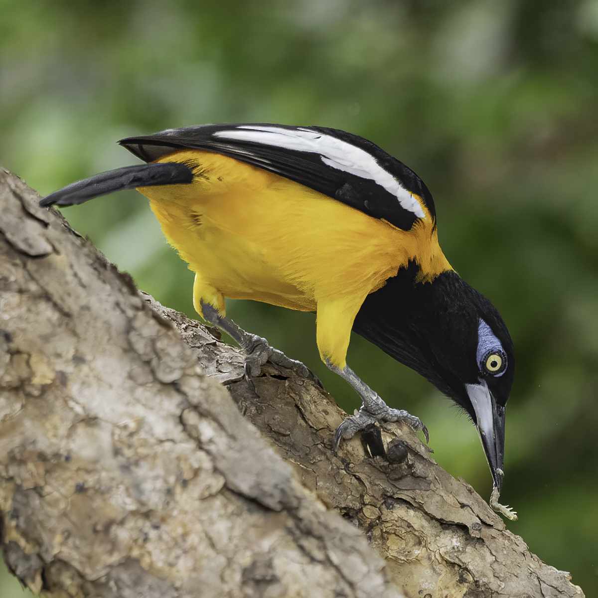 Wow that was sure a nice find. What a bright, colorful bird, and a sweet setting for it. Catching it with the grub tells such a good story and adds a lot of interest. I like your square crop, you could go just a bit looser on it and still avoid the distractions. I just personally favor a bit more breathing room in images, but that's taste...