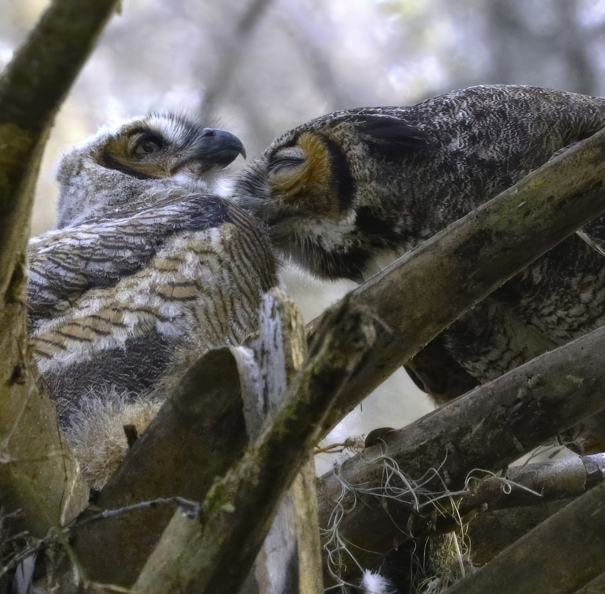 What a treat to find them in a nice setting, sitting together. I like your timing with their heads facing each other, it keeps your eye moving between their faces and within the frame. The square crop looks great to me, I am finding a lot of times with birds that it just suits better than other choices. Very nicely done and congrats on the quick sale- not surprising!