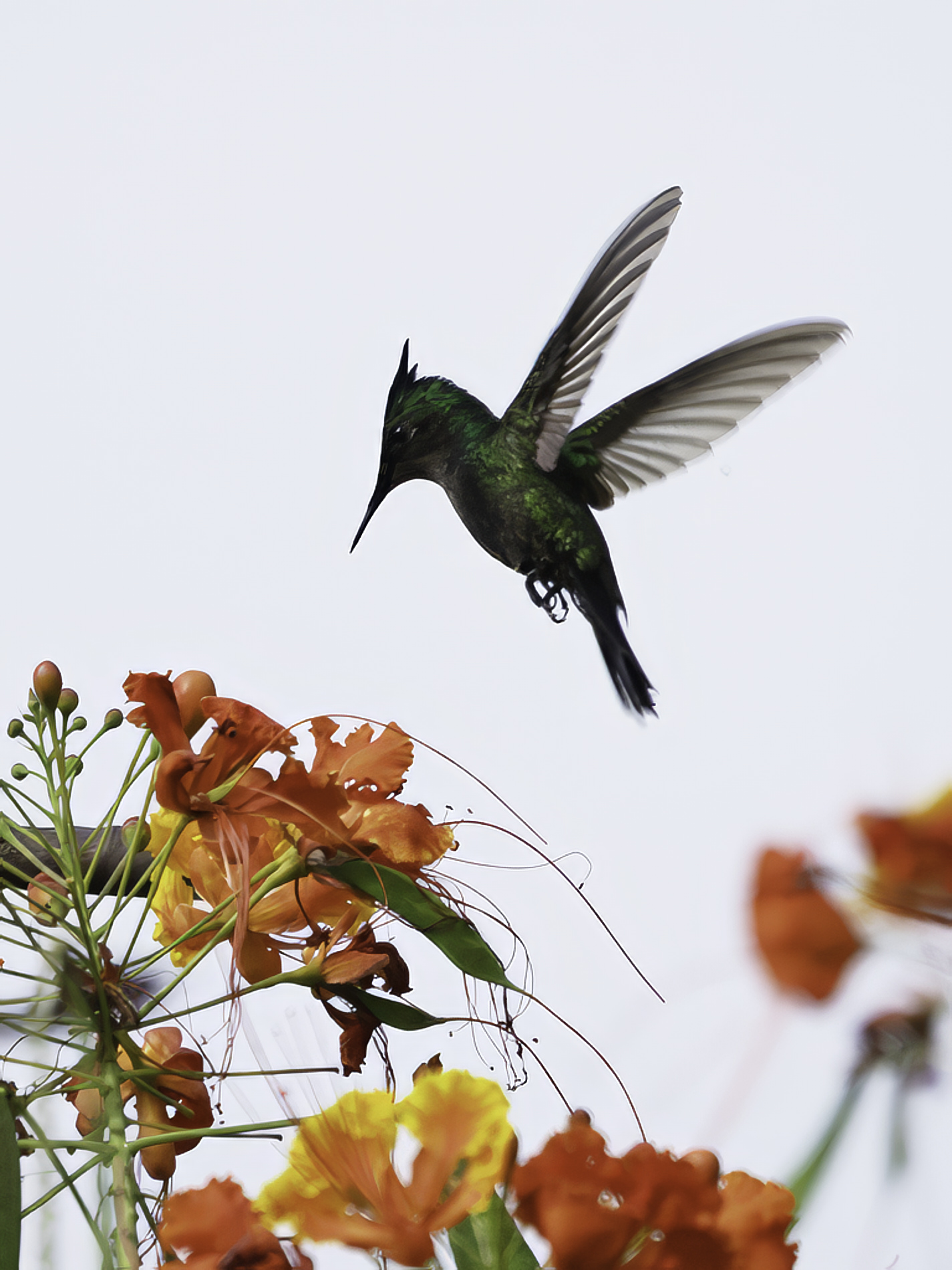 You managed a nice capture with a good wing pose, for having such a fleeting opportunity with this little one. I like that it's hovering just over the flowers without the bill buried in one, as can happen with hummers.