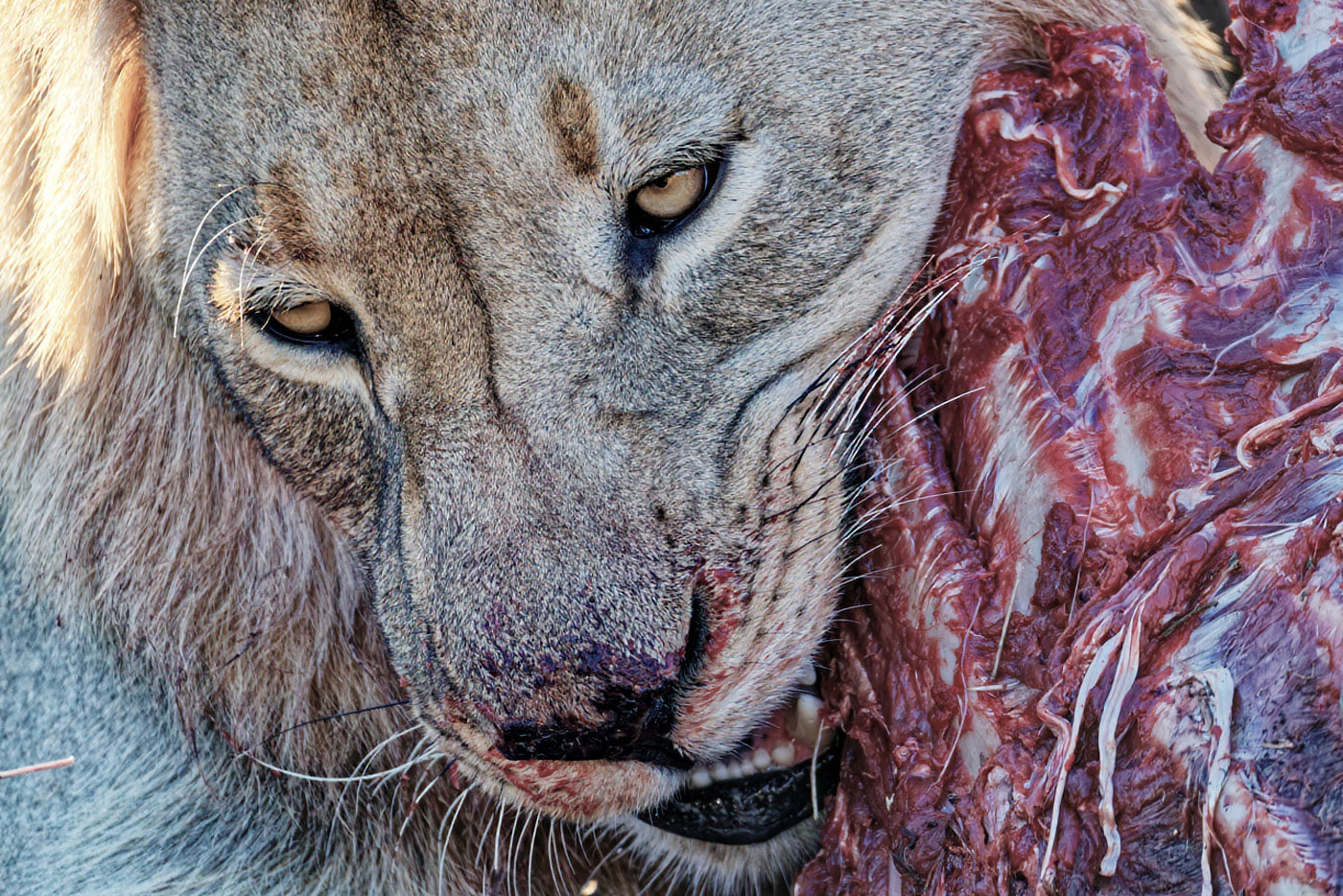 I really like this tight shot. There are good lines and shapes- triangles specifically- that make a good composition. Filling the frame with the important part of the action was a nice choice, and minimizes some of the gore. Maybe for Nature competitions you'd need more of the scene, but I think for an open category that wouldn't be a consideration.