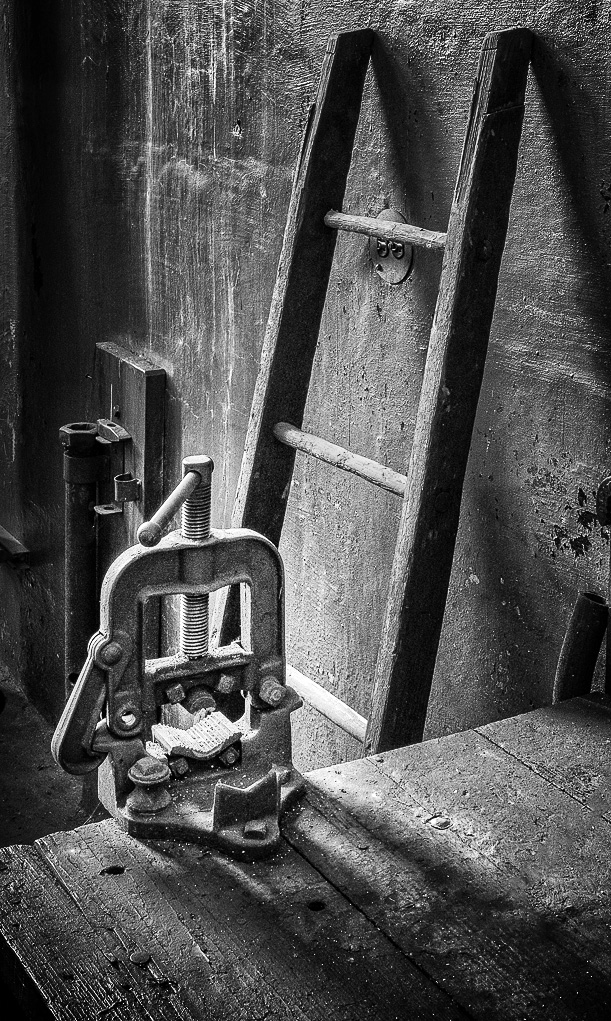 Henry - I like your image. It's fun to find these antiques, but hard to get just the right composition you might want. I thought the clamp (?) and the ladder were the "stars" of the image. So, I removed the cord and cropped out the horizontal tools. Using curves, I gave it a more dramatic look. It's another way of looking at your image. It's just under 400pixels, so might not look good. |