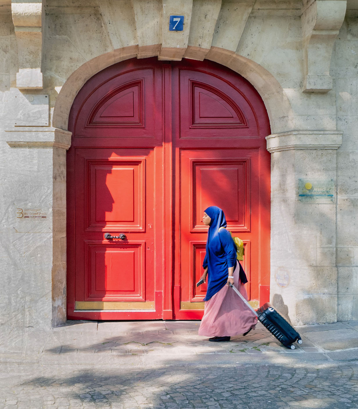 I love street scenes with people walking somewhere, and I think this is especially successful because of the place (love the cobblestones, the rounded red door, and the stonework) and the woman with the head scarves and the suitcase walking purposefully. A nice and interesting photo.