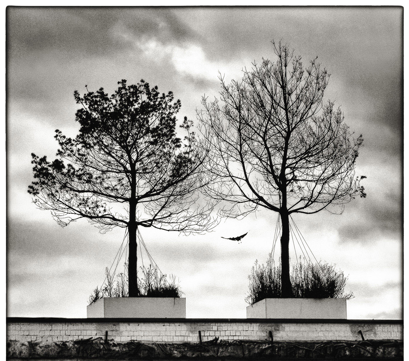 I like the photo, but not sure I like the bird, because I feel that it just disrupts my feeling of foreboding that I get from the two trees, the graininess, and the sky. I disagree with Michael B. about the building. I think adding more building would be even more disruptive than the bird. |