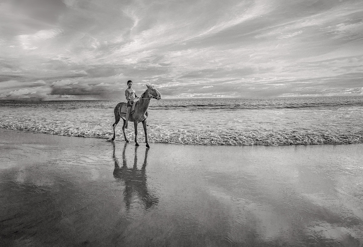 I followed Lance's suggestion (see below) and made 2 lighter versions. I first added some improvements; I darkened the transversal section of sky just above the boy on the horse, homogenized the top 2 corners and removed the dark spot below the reflection of the horse in the sand. Below I applied the crop you suggested to the lightened versions I made in reply to Lance. Both of your suggestions are great. Thank you. |