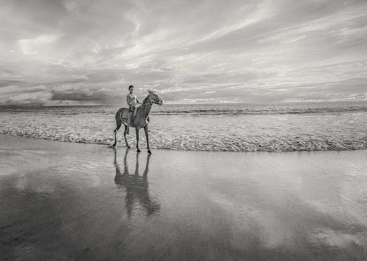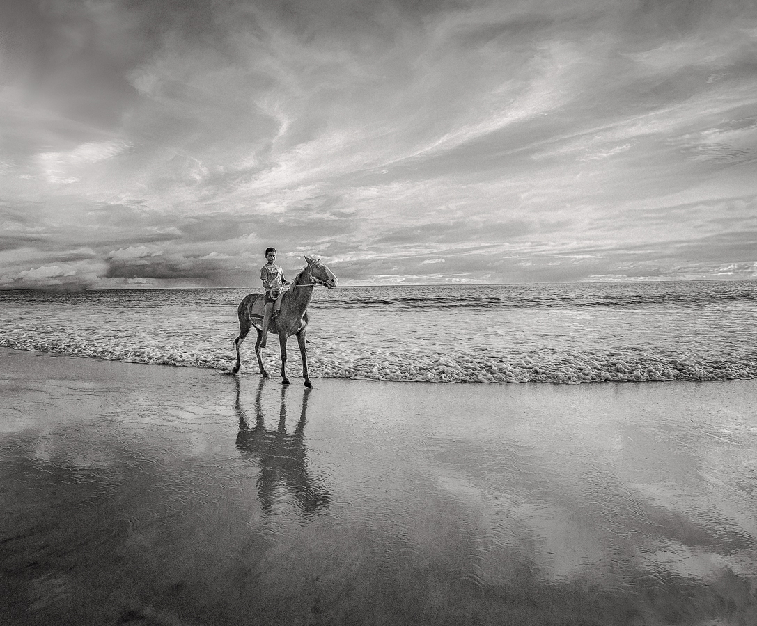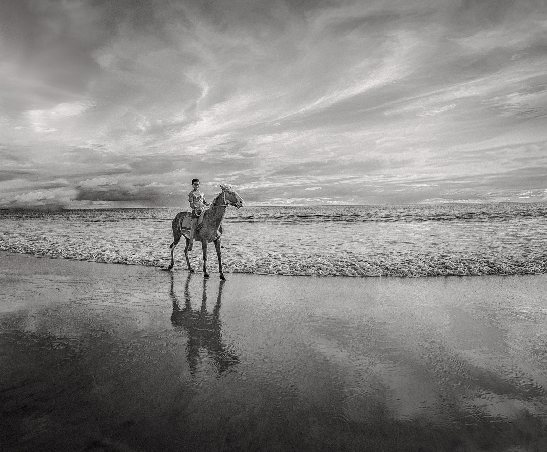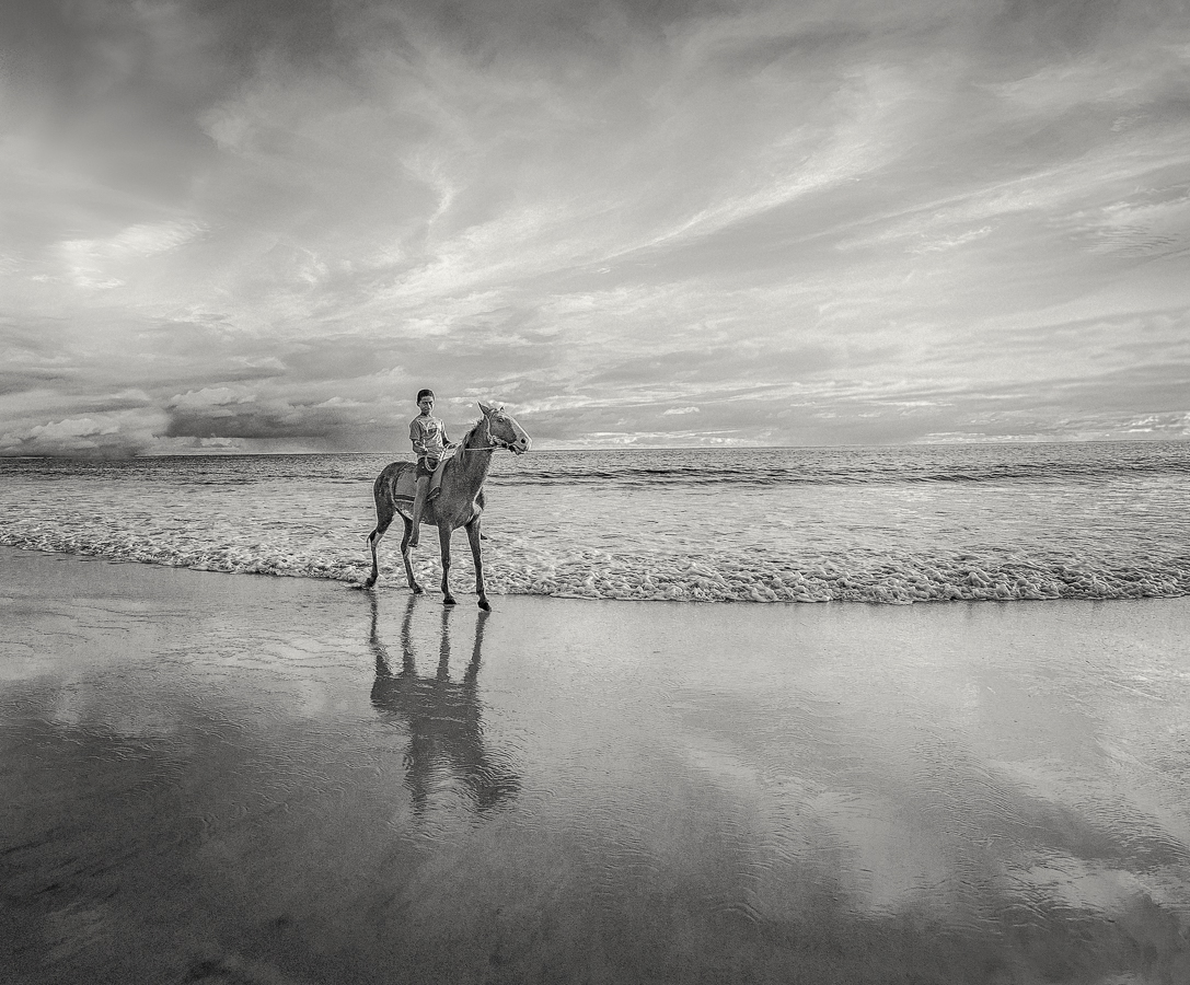 However the beautiful beach and sky are the subject - at least for me, the person who made the image - and the boy on the horse complements them very nicely. Imagine that I separate the boy and the horse from the beach and sky into 2 different color images. If you had to choose only one, then which one would you put on your wall? For me, it's hand's down the beautiful beach and the sky. Part of my decision has to do with the fact that the boy and horse are actually small in my original photo and don't have a lot of definition when we crop in. In B&W things are different. The beach and sky are not as dominant as in the color version and the definition of the cropped-in "subject" is less a problem in B&W. Your crop is a good solution in B&W. If I submit either the B&W or color image for competition I will adopt a similar format. I have several other versions where I also removed more from the bottom or the top and fiddled around with overlays to see how the golden mean and other proportions applied. I'm still looking for a slightly different placement. |