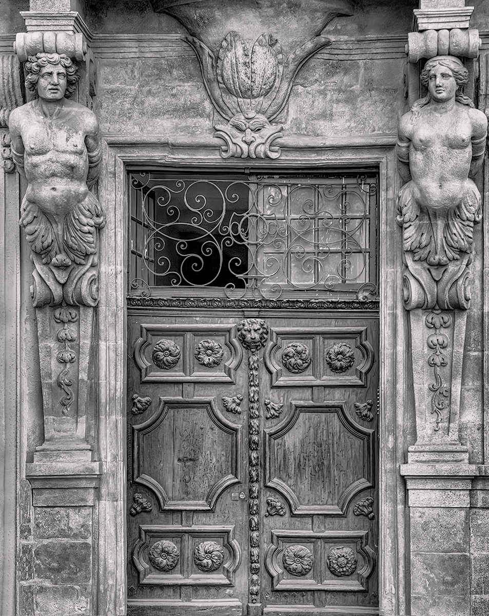 I see and agree with your point. I worked with the color image I currently have. Although my memory may fail me, I believe there is a sort of ledge-like step that protrudes outwards. Like many other images from an earlier period that I've presented lately, the originals still haven't been merged to my current catalog, so I can't verify this. For the anecdote, this doorway is maybe a half a mile from where my Mom lives. There is a café just to the left with a big outdoor patio. They were nice enough to allow me to move an outdoor menu temporarily so I could get the shot on a tripod very early in the morning before there were too many people. |