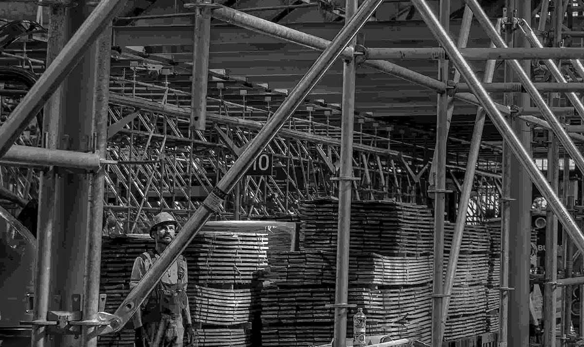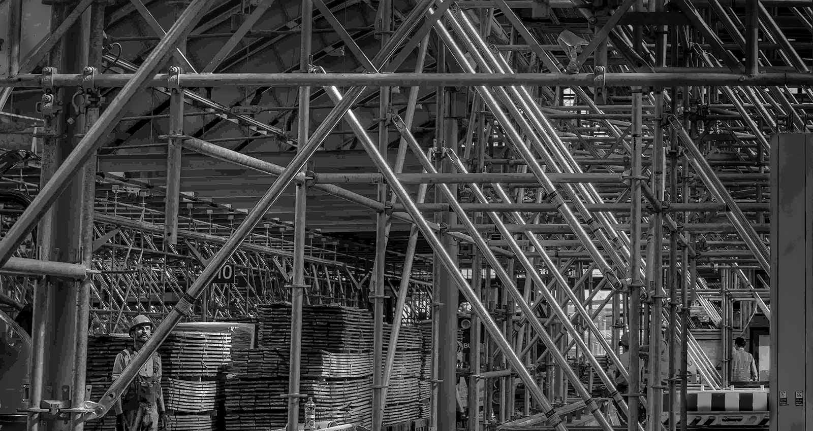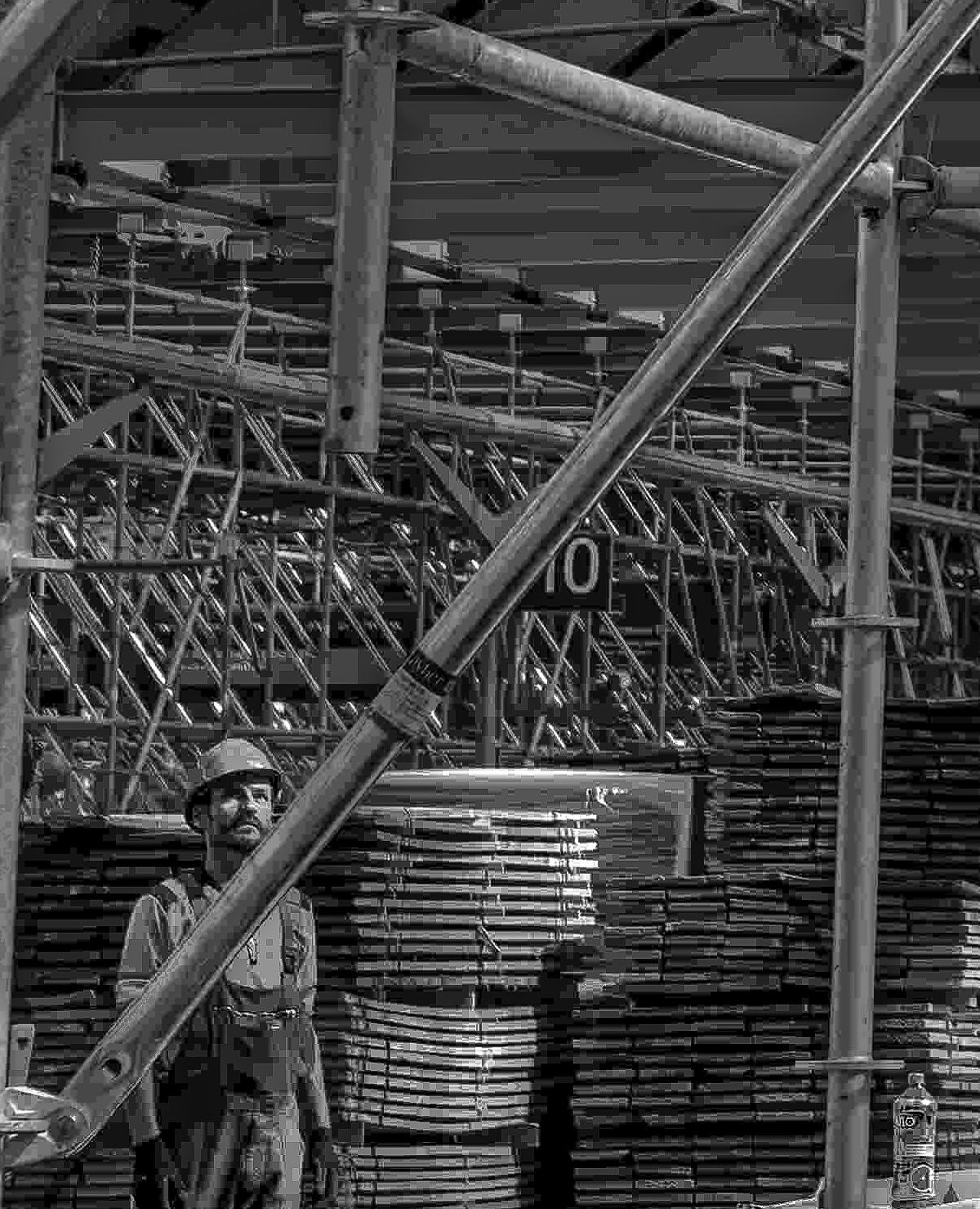 Peter, Like Jim I was inspired by some of the detail in your image, particularly the construction worker in the bottom left corner. Coming off of a long road trip with a couple of photography exhibits in San Francisco, it was noticeable that most of the images are black and white, of course... (!) but almost all involve people. I present a few crops I made yesterday from your picture. These were extensively retouched with Lightroom adjustments, intended to enhance separation and composition. The poles create these regular geometric areas that are easy to select and work with the brush accessory. I also used the luminosity adjustment to attenuate the brightness of the dominant diagonal poles in the middle of the crops. In case you are not acutely aware of it, I would like to share with you that there is a curve associated with every Lightroom adjustment and that by using it experimentally with multiple points and judiciously observing the effect produced by moving them you can obtain very good quality toning. I'm sure Darlene knows this since she indicates the use of curves in the descriptions of her images. |