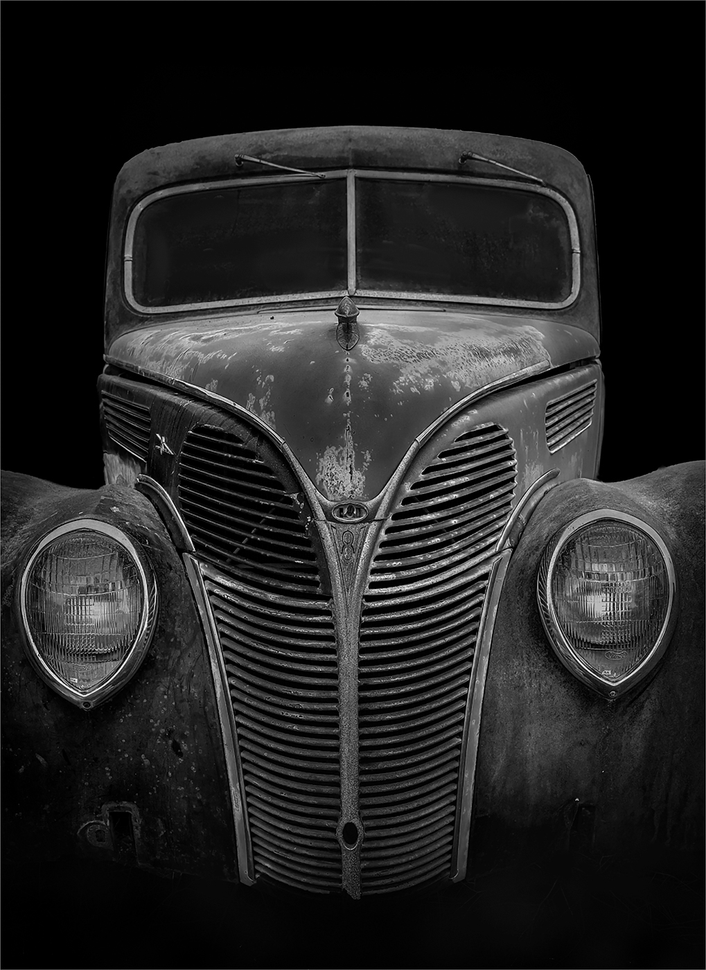 Like the b&w choice for this image because for me the lines and texture is the interest more than the color. I feel placing the point of interest on the headlight and fender with darker tones fading to the rear of the vehicle was a good choice. Nicely done, |