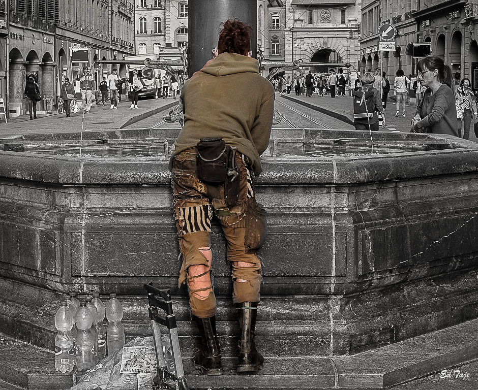 While I prefer the colour image, I think toning down the woman at the fountain with the red sweater would help to remove a distraction. Mono has it's merits so I tried something different, and left the main subject in colour and then put the rest of the image in grey scale. I think this puts attention on her and as you said her pants while still leaving the leading lines to draw one into the scene. I opted for BW over the toned image as in my mind the pants blended too much into the rest of the scene. |