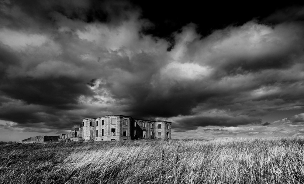 I like the BW version as it seems to convey the past which seems to fit the aging old building. The sky with the dark clouds adds to the mystery of the building . I did one crop which I think puts a bit more attention on the building against the sky and to some degree adds to the loneliness on the plain, |