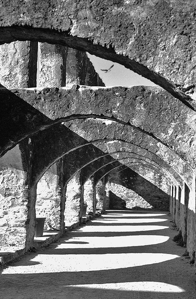 This is a good image with good toning and detail, The light playing of the rock structure in my mind creates a welcoming feeling into what could be a rather foreboding environment. This is to me reenforced by the bird in the upper part of the image. There is no comparison to the colour as the lighting and structure make this a good example of black and white. It is well done. I did try a slight crop along the left side up to the structure with a slight crop along the top to maintain the proportions and to see the difference removing the lower structure and sky would make. I have mixed feeling on the difference |