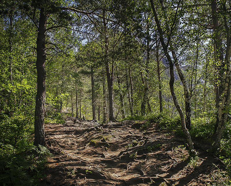 Nigel, this is nice capture that transmits the feeling we have when we hike in the forest with the sunlight filtered by the trees and leaves. I like the image. Since you state your goal was the trail, I took the liberty to crop the image a little. There is some green between the tree on the right and border that creates some distraction. I also darkened a little bit the lighter upper part of the image and increase the contrast a little. Let me know what do you think.