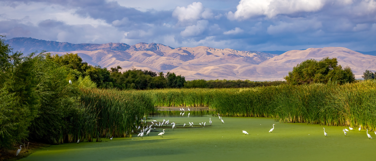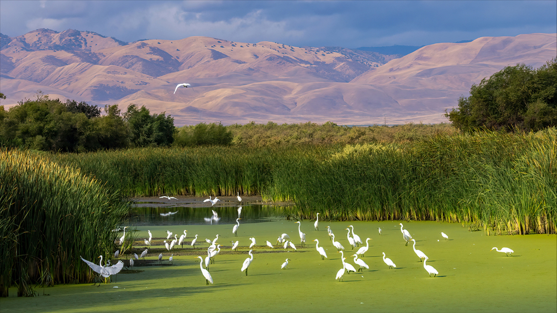Great comments. Thanks! Here's a second image that has cropped out the bright cloud and the two edge egrets.