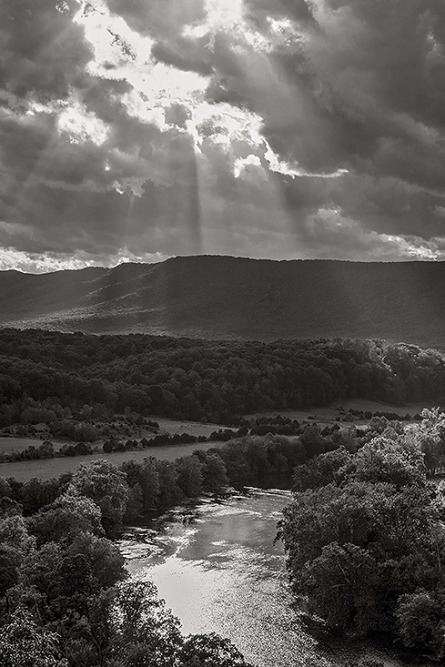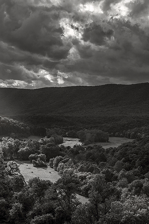 The overall is a pleasing view of a beautiful valley. "It tells the story" and captures the atmosphere. The center of gravity, the interest point, the bright areas, the strongest contrasts, patterns, depth, and shapes are all on the far left 1/3.Which for me, almost makes this picture a composition of 2 separate pictures. Each with a life of its own giving 3 options to choose from: a, b, a+b |