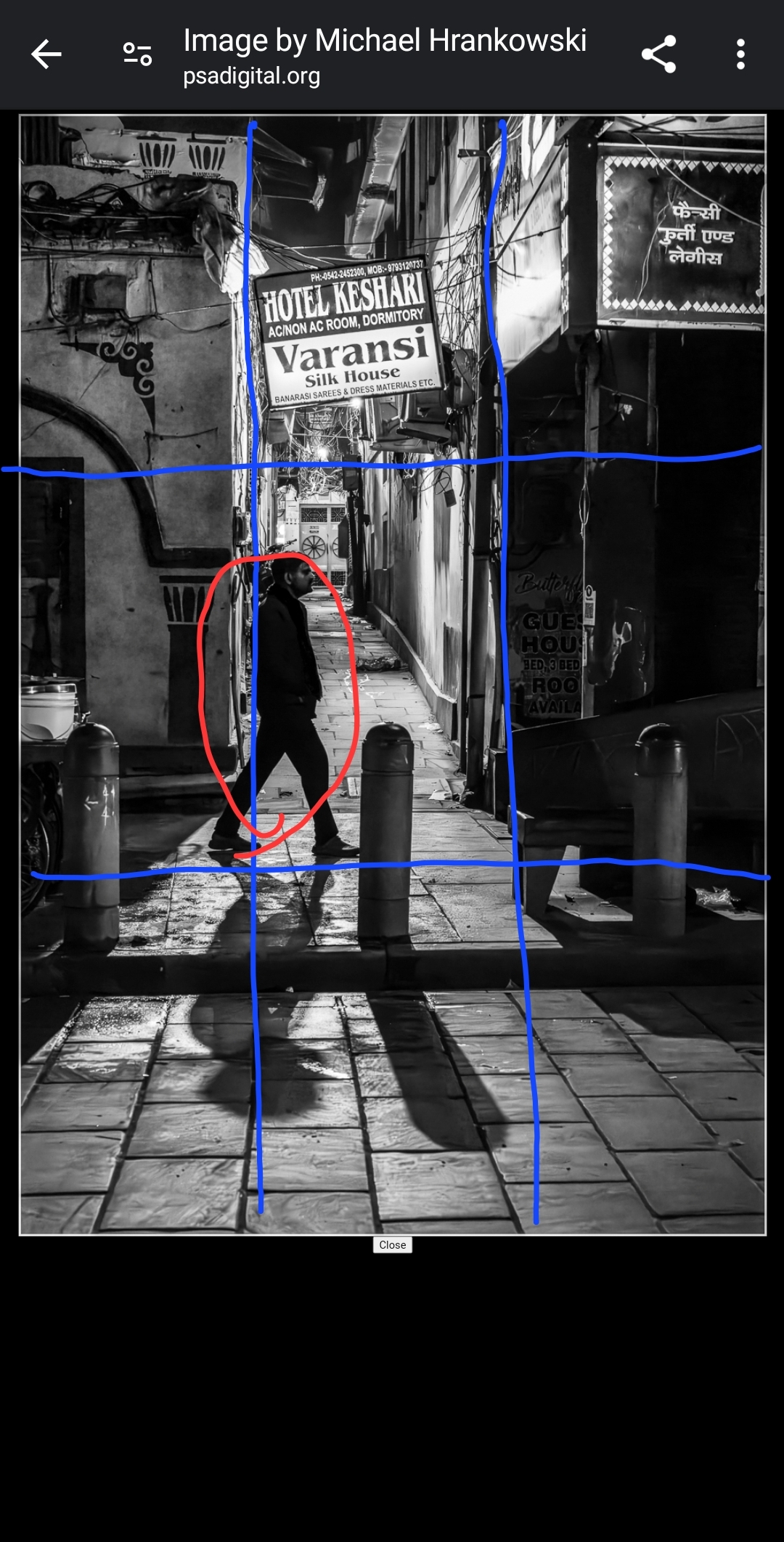 I see here 3 vertical strips with 3 object's on the top of each. 3 different planes (fore middle and back) and a subject captured right in the power point of the frame. This is good street photography. I wish the wheel in the background did not touch his forehead. |