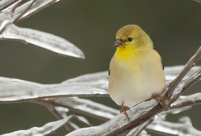 Nice shot! The bird is gazing directly at the camera, and its eye is in sharp focus. The crop provides ample space for the bird to move towards the right. Although the photo appears to be slightly over-processed, with some areas having good texture while others lack detail. The ice adds a unique touch that sets it apart. Despite not getting the snow you were hoping for, I think the ice worked very well. |