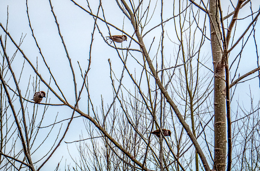 Storytelling: The leafless trees with birds starts my mind thinking about the harsh conditions the birds have to survive in. The light blue sky increases the coldness feeling. The birds appear to be looking for something, which the story in my minds continues build on wondering if they will find food.