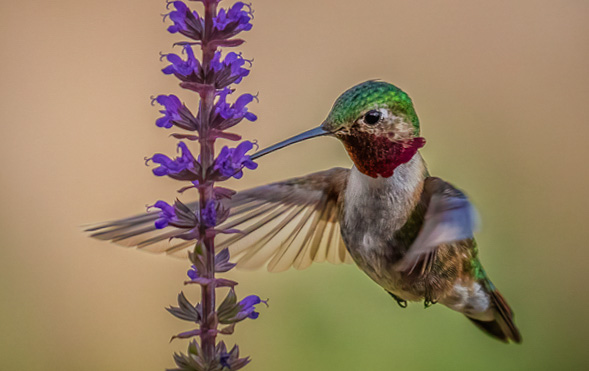 Impressive capture! Someday, I'll be somewhere with a camera and a hummingbird. I found the composition making me eye jump back and forth from the flower and the bird. I know you wanted to keep the top of the flower in the frame, but maybe some guidelines need to be bent now and then. Here is a version with a tight crop and lighten and adding color to just the bird. To me, it makes the bird the clear subject of the photo. |