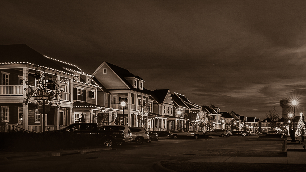 Here it is with some sepia tone added to it plus a number of radial, linear, and brush masks to play with the foreground/parking area, the sky, a few of the street lamps, plus the houses themselves.