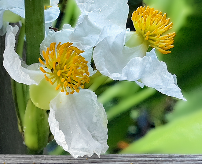 Judy, lovely flowers with a bug or 2 - I agree about the top rail but what about cropping it out or maybe you were using them to set a boundary. I have attached a suggested edit where I cropped out the top rail, cropped out some of the right side as not needed, straightened the bottom rail, and got rid of the dead part of the leaf fin the lower left - just to see what you think. Ray |