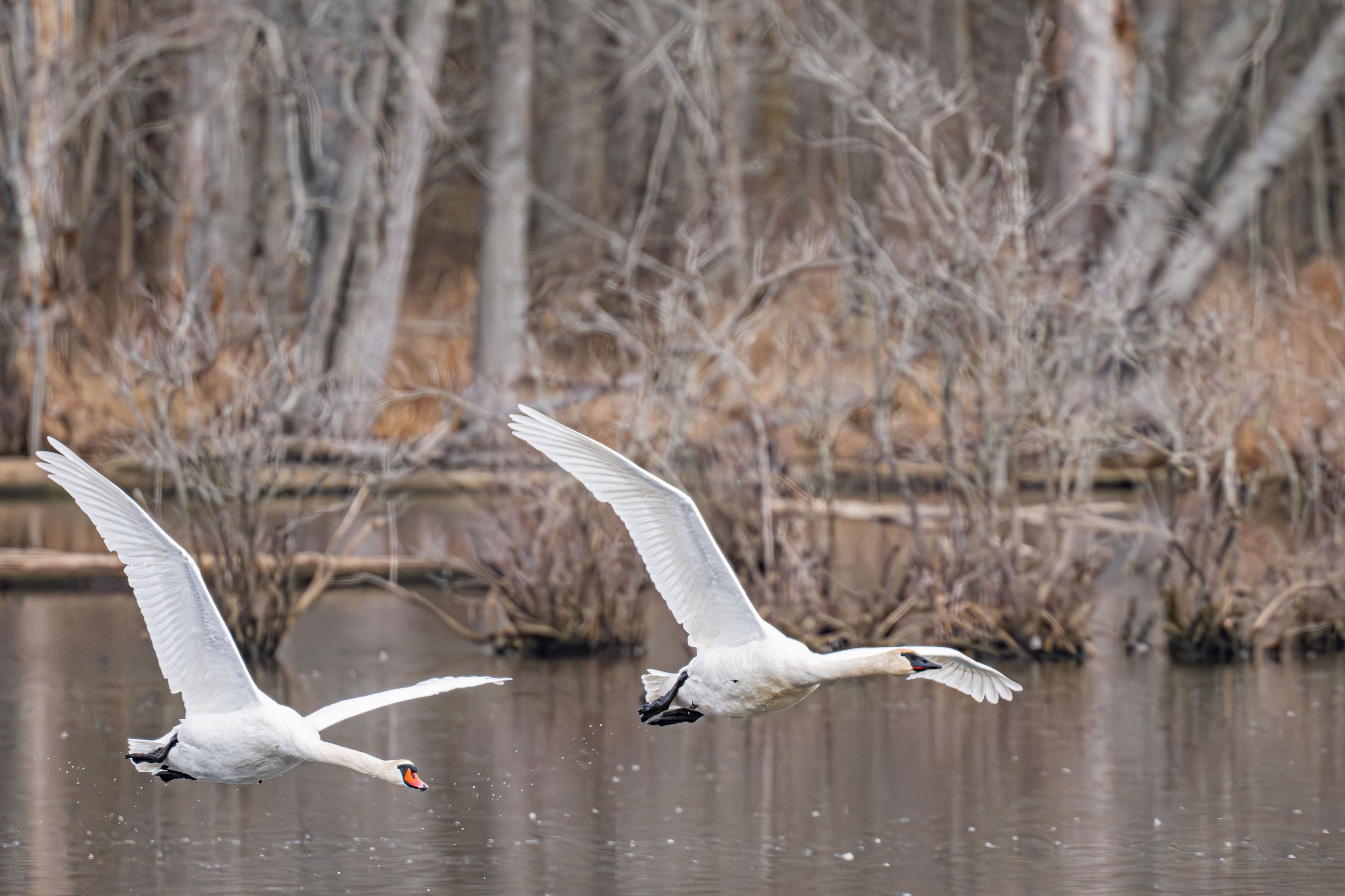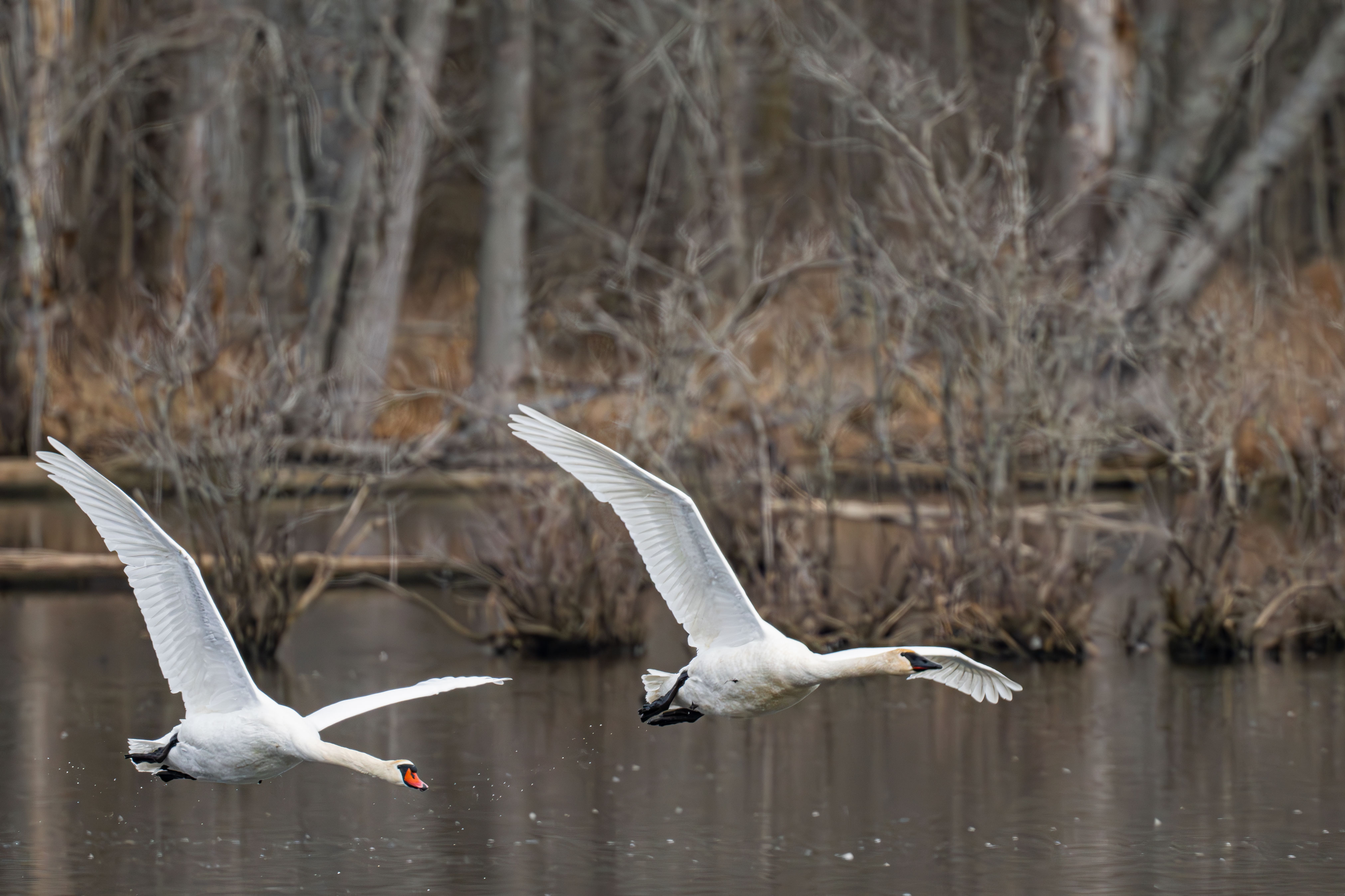 Here is another shot later in that series. Same conditions, same settings. I see there is gray in the whites in the patagials (I think that's what the feathers are called along the leading edge of the wing),but the rest is fairly white. The birds are a bit soft (my bad in tracking), but there is more blurring in the background, and there is detail in most of the white feathers (except for a just-on-the-edge blown-out area along the ridge at the base of the neck and back.