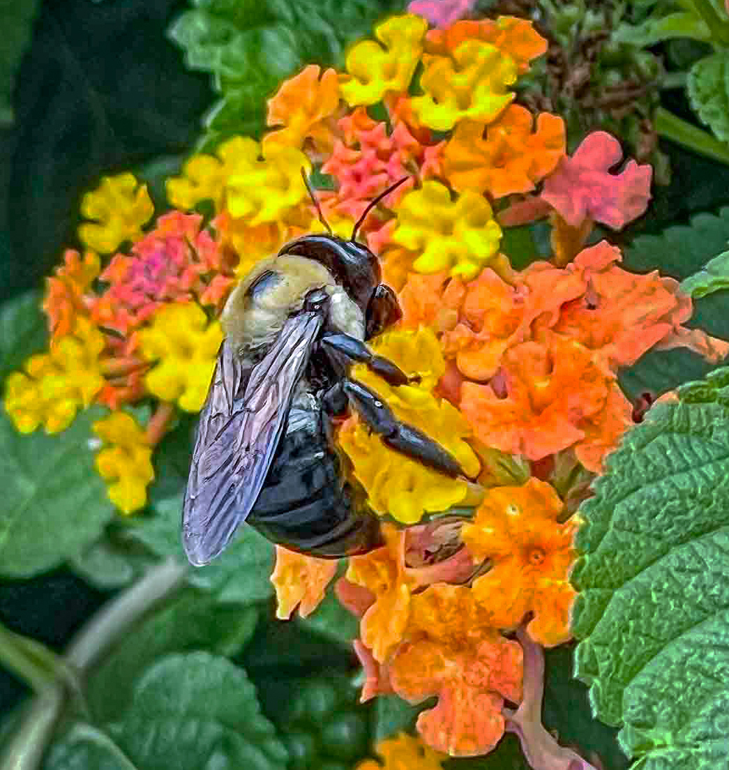 What a colorful and interesting image. The bee is very sharp. I agree with Tom in that the flowers compete for attention> I did something a little different. I did a bit of a vignette around the bee.