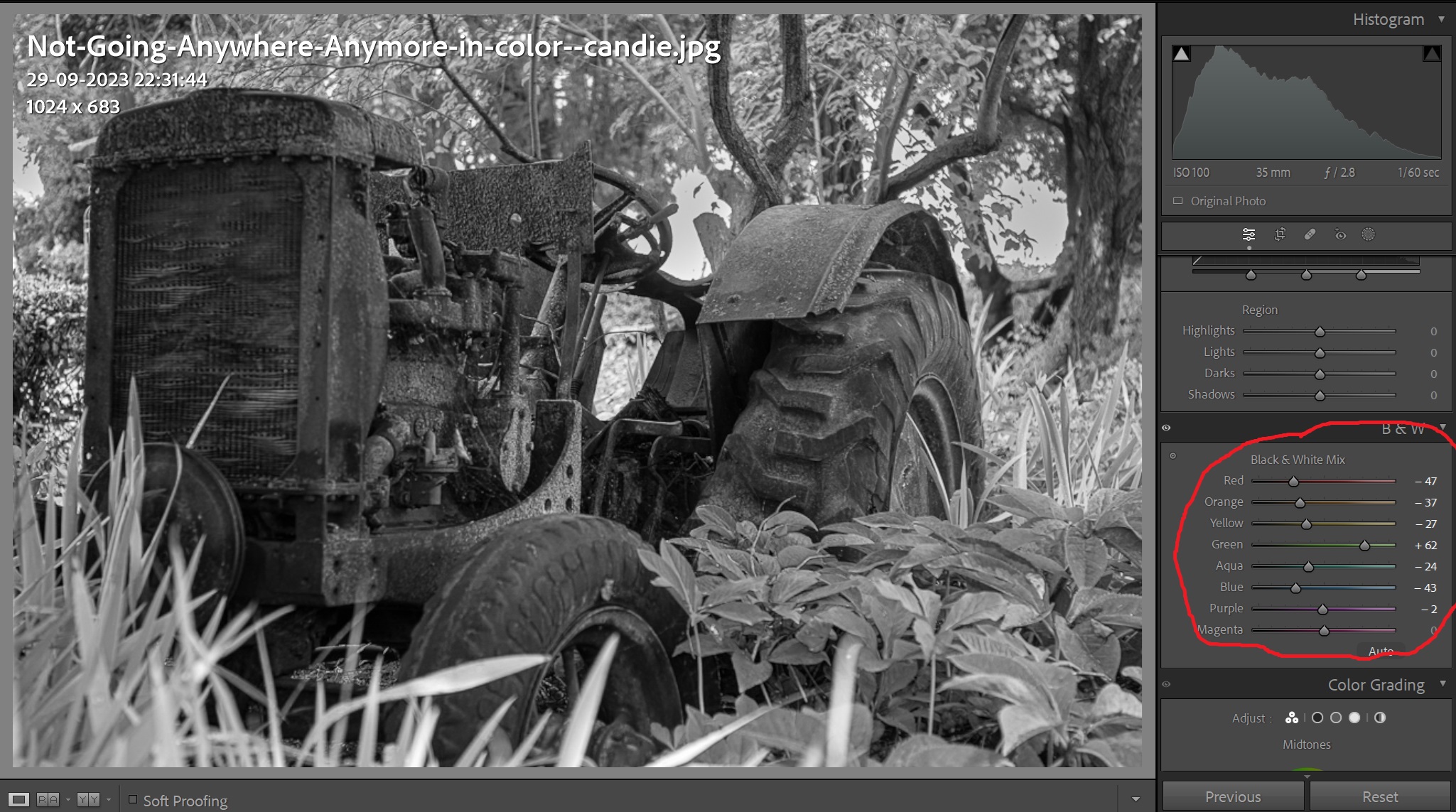 Not sure if that was easy to follow so I took some screenshots. (1) Adjusting color channels in LR, (2)Then I selected the tractor, increased contrast, opened shadows, increased texture and clarity, and slid the dehaze slighter to the right. Finally I went into Photoshop, added a background layer, ran a high pass filter on it at 3 pixels, used the hard light merge and flattened the layers.