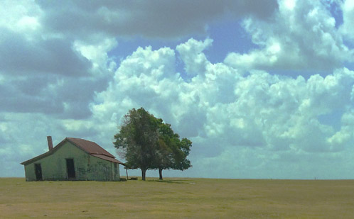 I like the large empty space as it is indicative of this country. I prefer the original colored image. I have attached another version that emphasizes the leaning of the old building and the width of the image emphasizes the open country.