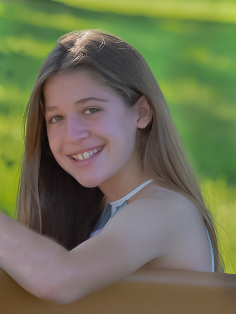 Well posed image of a pretty young girl. Changing to black and white takes the life out of this image. Reducing the saturation and brightness of the green and increasing the contrast of the face a little makes a vibrant image. I also clone stamped out the distracting brightness on the arm. A good people shot. |
