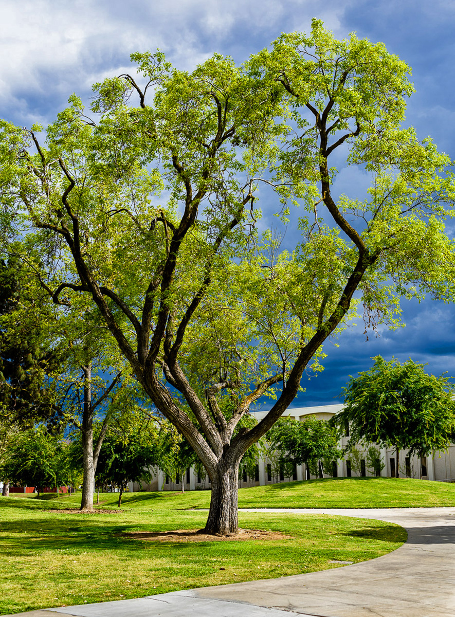 An impressive tree that you have staged well. I like the contrast of the blue, dark sky, which makes me think of a thunderstorm. Plus the bright green of spring in the foreground.
