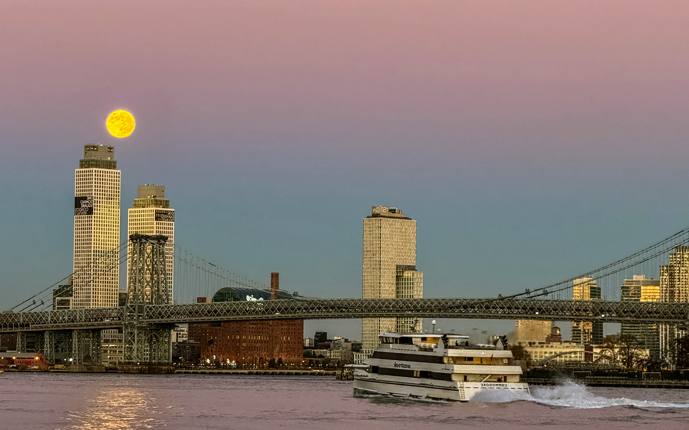 Douglas, What a fantastic scene! The light, the moon, the reflections in the water, the splashing water of the boat! Great capture! Worth hanging!