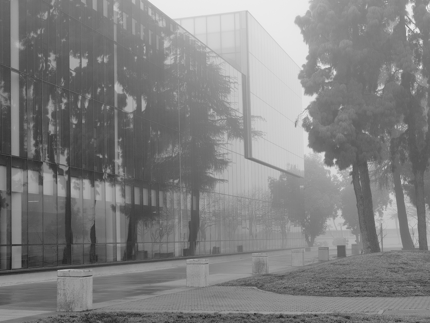 The composition is perfect, the path leads into the picture and allows the viewer's gaze to wander into the distance. To the left of the path are the mirrored glass surfaces of a house, in which the trees on the right are reflected. I can feel the atmosphere, the fog, it's getting foggier and soon I can't see anything anymore.