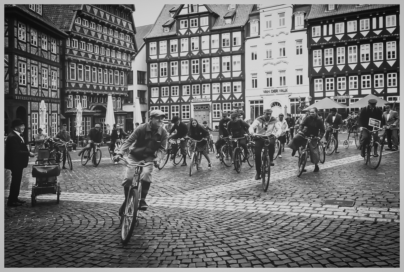 Sabine, Great period shot. I was drawn to the barrel organ player and the two front bikers. The buildings nicely frame the bikers with the middle building pointing to the front biker. The individual's clothes drew me into the image. I was especially curious about the organ player. The monochrome and thin white boarder enhances the vintage look. I also like the color version which shows clothing details. Sounds like a fun event.