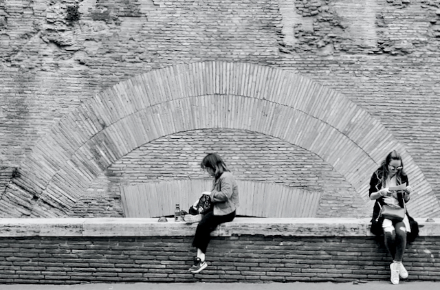 I really love the atmosphere and feel of your image -- the two subjects on the same wall oblivious to each other and engrossed in their own worlds.