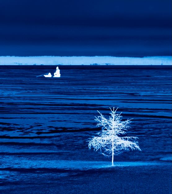 The changes I made were to add some vitality to the blue and also re-cropped to add more emphasis on the angler and deleted one of the trees. It's cropped to exact thirds. Just playing.
