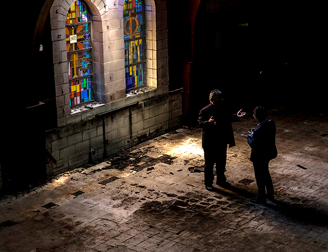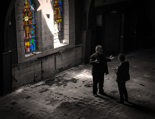 I think the lighting helps tell your story. It is an old building that has seen better days. It is too bad that the priest was not standing in the bit of light :)
