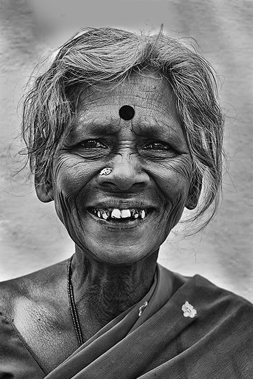A wonderful portrait of a most interesting woman. your decision to go monochromatic was a good one for reasons given. I do think you may have overdone the post-processing as the tonality hides her facial features.