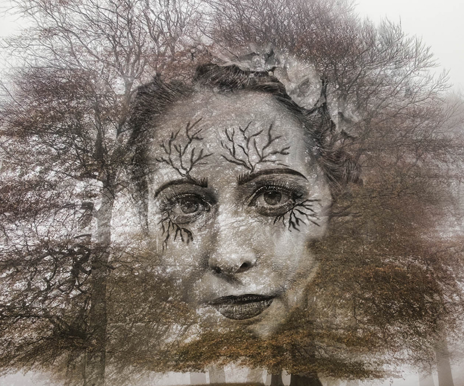 I'm not sure if the whole concept works for me. I decided to apply a more radical crop which featured just the woman and the branches. The green ground cover was a slight distraction. Also, upon closer look, I see several of the branches to her left look as if they were obviously duplicated. Not sure what was the intent there.