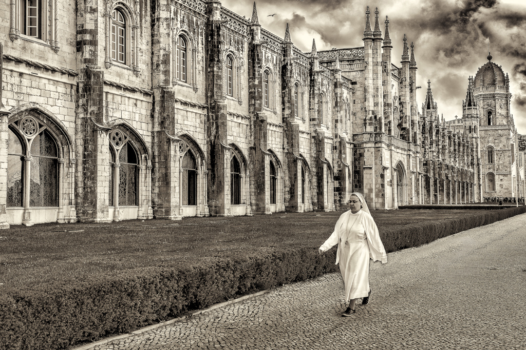 Think you nailed this with your decision to go monochromatic. I do see Dick's "artifact" concern. I think it the residue from the block in the original. I thought about trying to move Sister further up into the scene as she is almost out of the frame - however my parochial school upbringing tells me not to mess around with nuns. I will probably hear from her about this rendition. . .