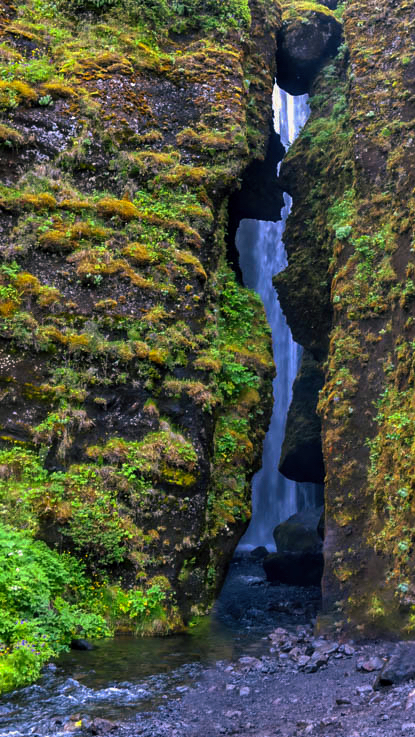 Deborah, I'm leaning toward the original shot with the foliage around it. Also, the full length of the falls is evident. The close-up cropped look does not feel like it's as hidden as the original. I did run it through a few tools.