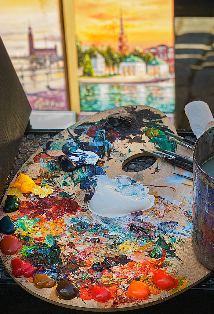 The painters are a fairly common scene traveling Europe and a nice memory. We bought a picture from a painter in Stockholm on our trip last June. I don't have that painting with me but the style looks similar. I think the image to my eye is a little flat and I would probably start by adding some mid-tone contrast. Attached image of a pallet that may have been from this painter. |