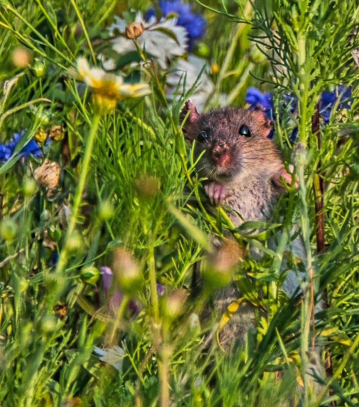 Great capture of this creature in a natural habitat. Unfortunately, to me, there was too much color conflicting with the subject. The red flower was distracting and taking my eye away from the rat. Tried a vertical crop to focus more on the creature. What do you think.? |