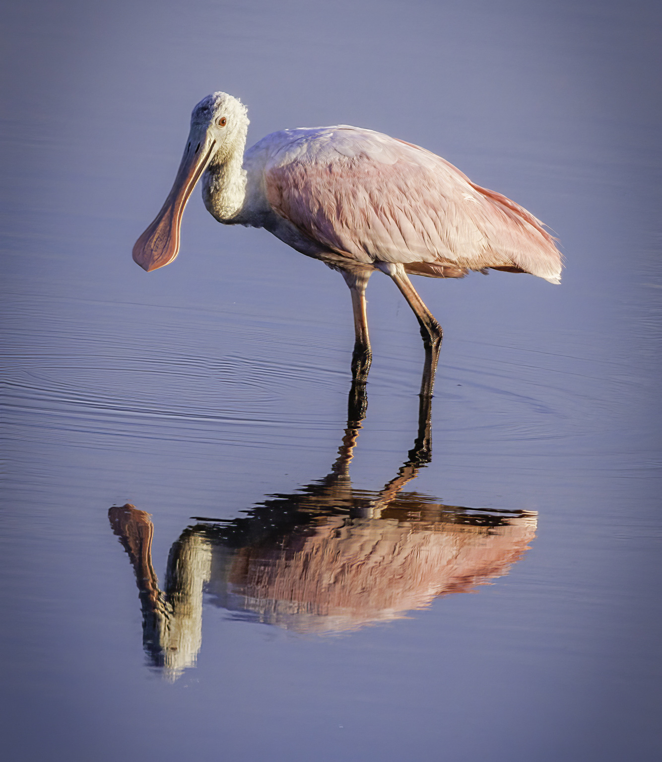 I played with several crops, as I had lots of space outside of the above image. In weighing in all the factors, I decided for the symmetry of the full reflection. I also wanted to keep the sense of motion in the reflection in contrast to the still image. The flamingo left last week after about a two week stay. Over that time I got 400 keeper photographs, so if I play with them as I have this image, I have a few years work ahead of me. |