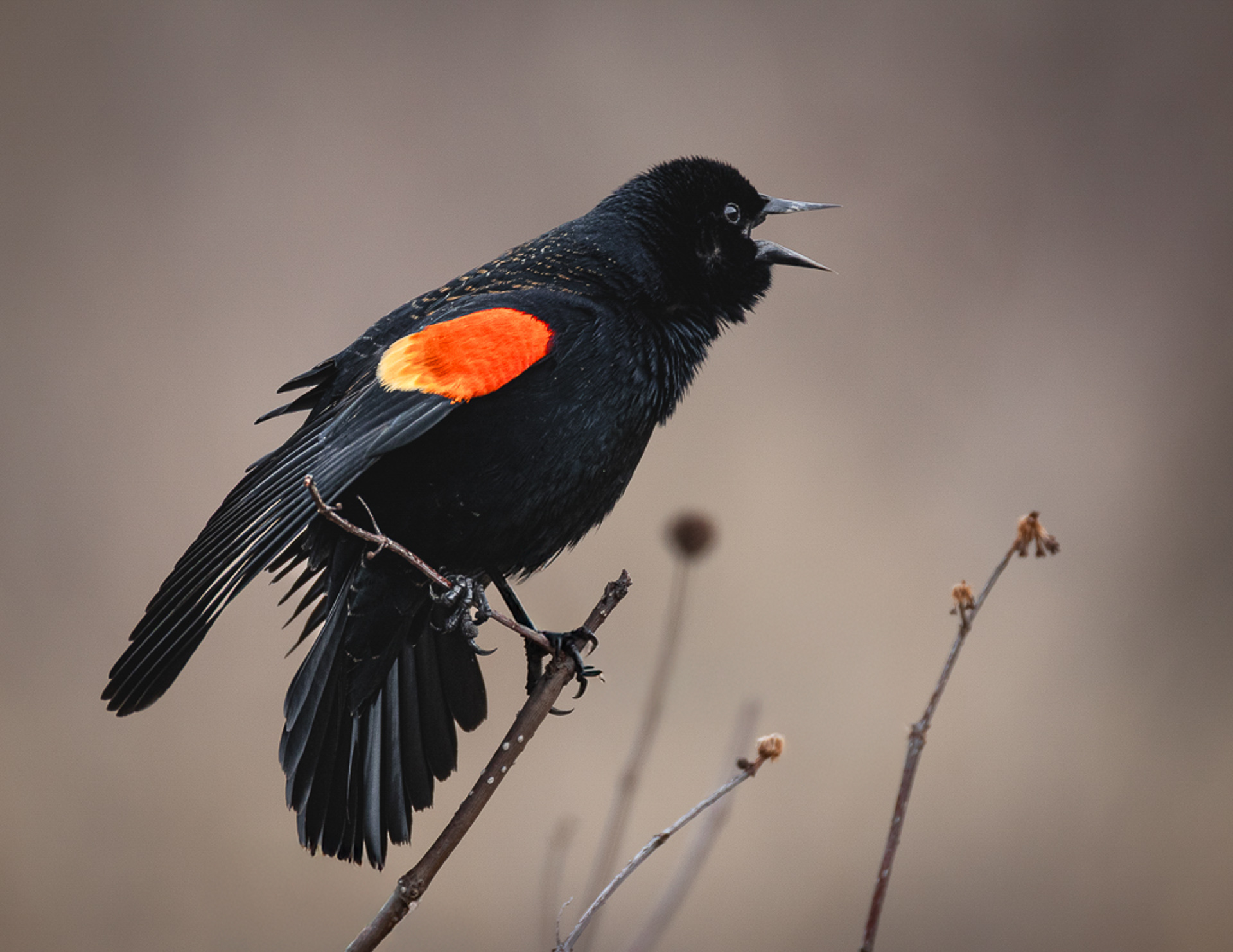 David, great photograph, in focus, nice crop and the story of the Redwing "squawking" as they alway do. I always like to face my birds looking right (some folk feel that since we write left to right, our eyes like it. Anyway it does not hurt) and I remove some of the branches, I thought they were a little distracting (a quick fix now in photoshop) |